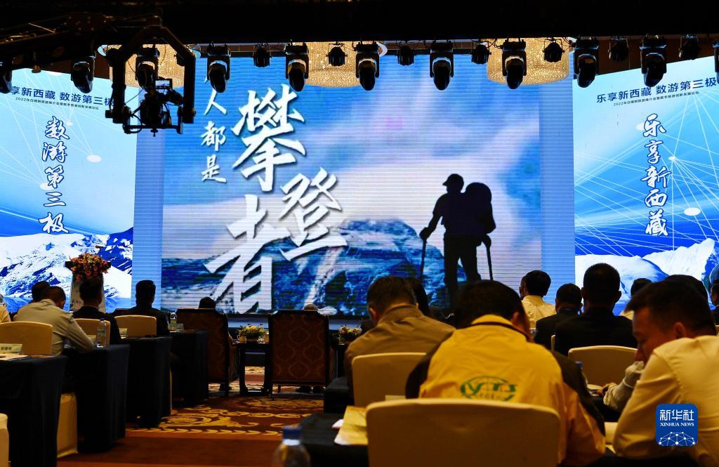 在2022年西藏日喀則旅游推介會暨數(shù)字旅游創(chuàng)新發(fā)展論壇上,播放“我想去珠峰”本地人采訪短片(7月15日攝)。新華社記者 張汝鋒 攝