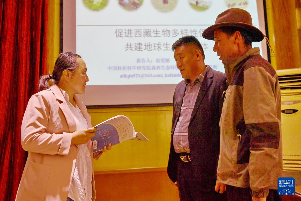 9月5日,中國(guó)林業(yè)科學(xué)研究院副研究員秦愛麗(左)同曲水縣協(xié)榮村林長(zhǎng)多吉(中)、護(hù)林員西洛次仁交流。新華社記者 張汝鋒 攝