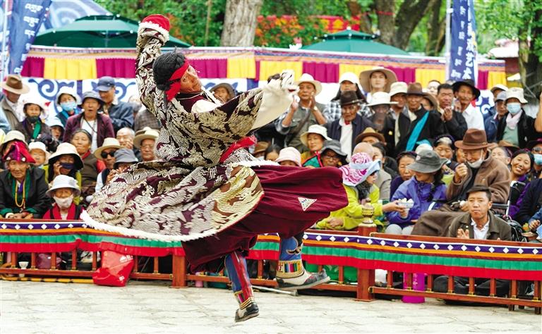 圖為8月8日,山南市洛扎縣曲措藏戲隊(duì)在羅布林卡表演傳統(tǒng)藏戲《卓瓦桑姆》。新華社記者 晉美多吉 攝