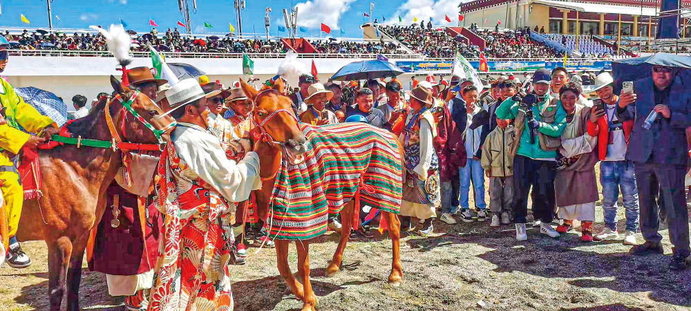 那曲格薩爾賽馬場(chǎng)內(nèi),來自西藏自治區(qū)內(nèi)外的馬主和騎手一邊相互介紹自己的駿馬,一邊等待比賽檢錄。魏冠宇攝