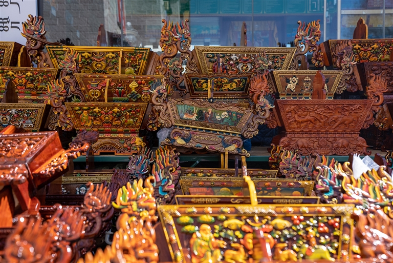 “老板,這個(gè)切瑪盒多少錢?便宜點(diǎn)我就拿走了。”“這個(gè)圖案樣式都是精心雕刻的,最低1300元,實(shí)在不能再少了。”次仁的店鋪前,不少顧客正在挑選“切瑪盒”,生意很是火爆?!扒鞋敽小笔菍⒕贫沸文竞杏酶舭宸珠_,左右兩邊分別盛入炒青稞和糌粑,再插上象征五谷豐登的“羅薩梅朵”和寓意吉祥的酥油花,寓意人壽年豐、吉祥如意,是藏歷新年家家戶戶必備的年貨之一。次仁告訴記者,“切瑪盒”根據(jù)圖案、顏料、大小、木材等因素,售價(jià)從幾百元到上千元不等,很多顧客普遍喜愛(ài)傳統(tǒng)樣式與圖案。