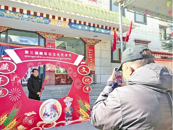 圖為活動中,社區(qū)居民與“藏年花”合影留念。記者 拉巴桑姆 攝