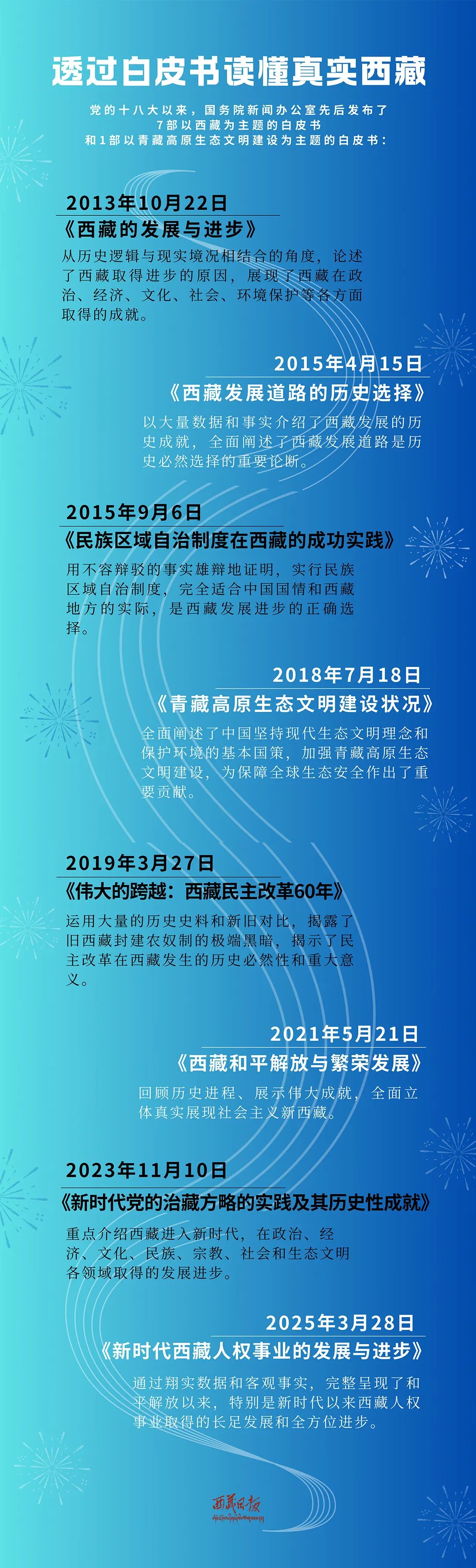3月28日,國務(wù)院新聞辦公室發(fā)布《新時(shí)代西藏人權(quán)事業(yè)的發(fā)展與進(jìn)步》白皮書。這也是黨的十八大以來,國務(wù)院新聞辦公室發(fā)布的以西藏為主題的第七部白皮書。這些白皮書涉及西藏經(jīng)濟(jì)社會(huì)發(fā)展的各方面,真實(shí)地展現(xiàn)了西藏步入發(fā)展最好、變化最大、群眾得實(shí)惠最多的新時(shí)代,各項(xiàng)事業(yè)取得的全方位進(jìn)步、歷史性成就。