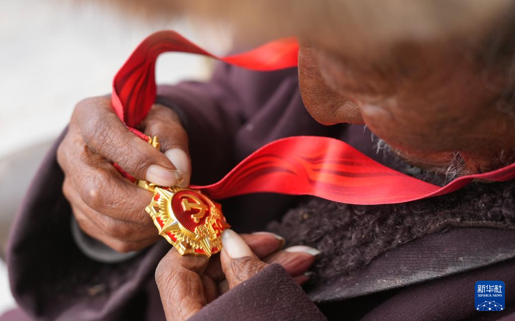索扎老人端詳“光榮在黨50年”紀念章(3月20日攝)。新華社記者 晉美多吉 攝