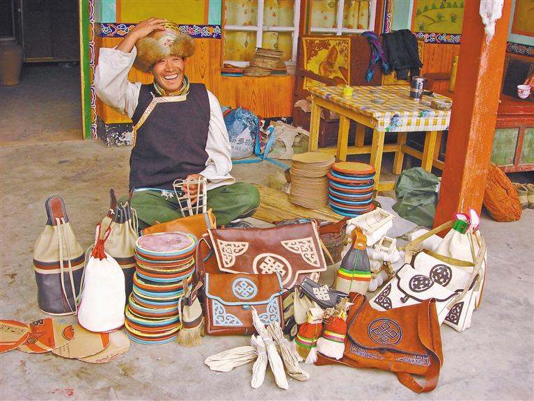手藝人展示縣級(jí)非物質(zhì)文化遺產(chǎn)俊巴皮雕作品 。