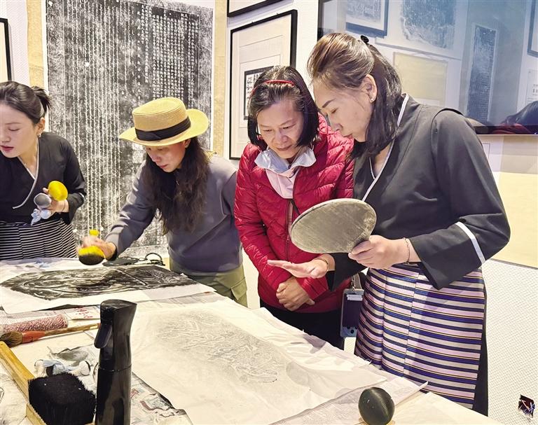 國(guó)際旅行商在日喀則石刻藝術(shù)博物館內(nèi)體驗(yàn)拓片技藝。記者 張琳 攝