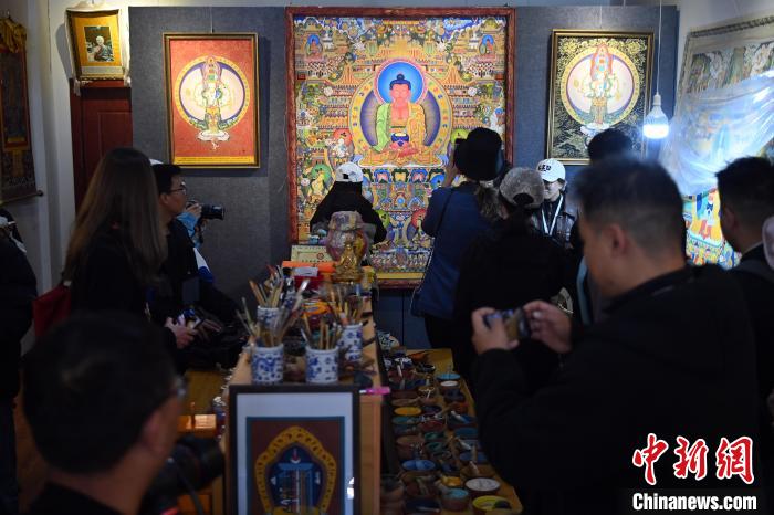6月10日,來自美國、加拿大、瑞士、韓國等國家和地區(qū)的中外記者、網(wǎng)絡(luò)達(dá)人走進(jìn)唐卡小鎮(zhèn)中的一家畫室觀摩采訪。九美旦增 攝