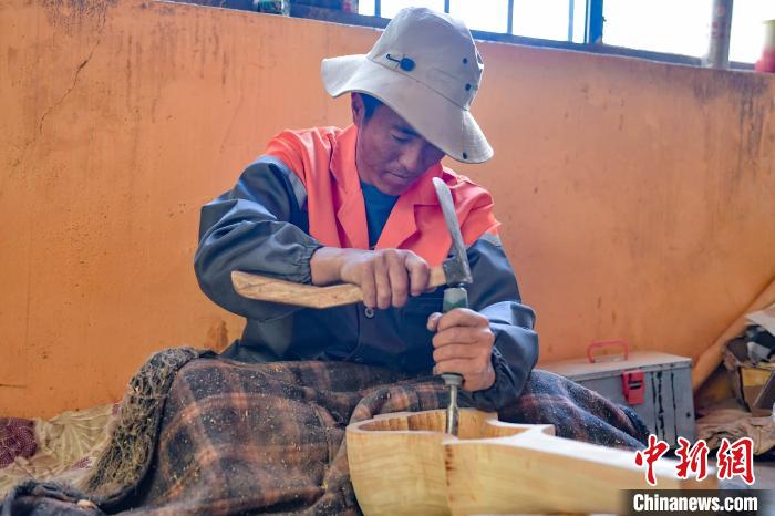 圖為拉孜縣熱薩村村民普瓊次仁正在進行雕刻。貢確 攝