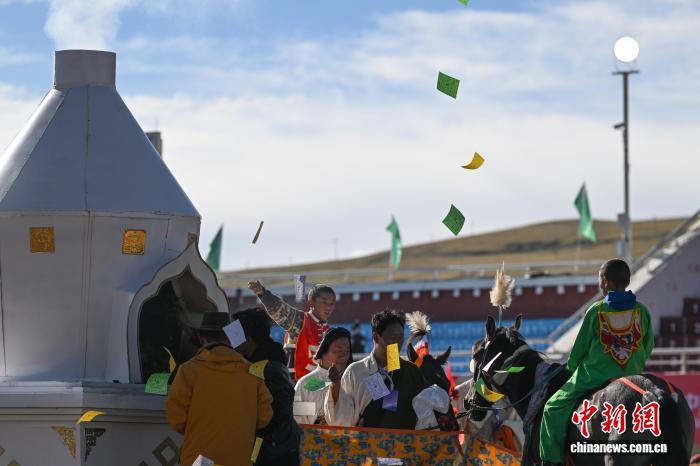 圖為恰青賽馬節(jié)傳統(tǒng)大跑決賽前參賽選手拋灑“隆達”(風(fēng)馬旗,藏族民眾的一種祈福方式)。中新社記者 貢嘎來松 攝