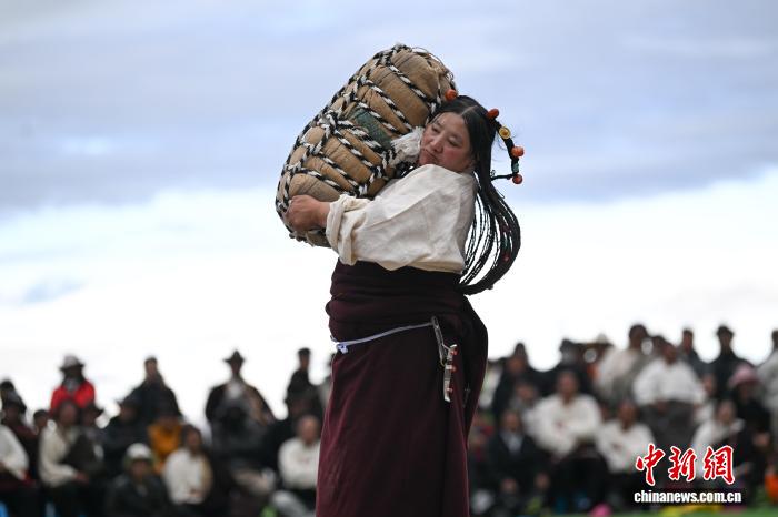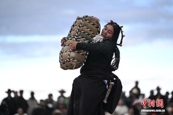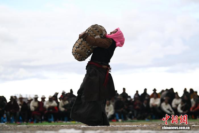 9月5日,2025年那曲市恰青賽馬節(jié)在格薩爾賽馬場(chǎng)開幕。當(dāng)日,賽場(chǎng)中不僅有駿馬飛馳,更有力量的精彩較量。在抱石頭比賽現(xiàn)場(chǎng),來(lái)自那曲市各縣(區(qū))的男女選手們鼓足干勁,挑戰(zhàn)自我。這項(xiàng)傳統(tǒng)體育項(xiàng)目,展現(xiàn)了藏北人民的堅(jiān)韌與力量。圖為女參賽選手在抱石頭比賽。中新社記者 貢嘎來(lái)松 攝