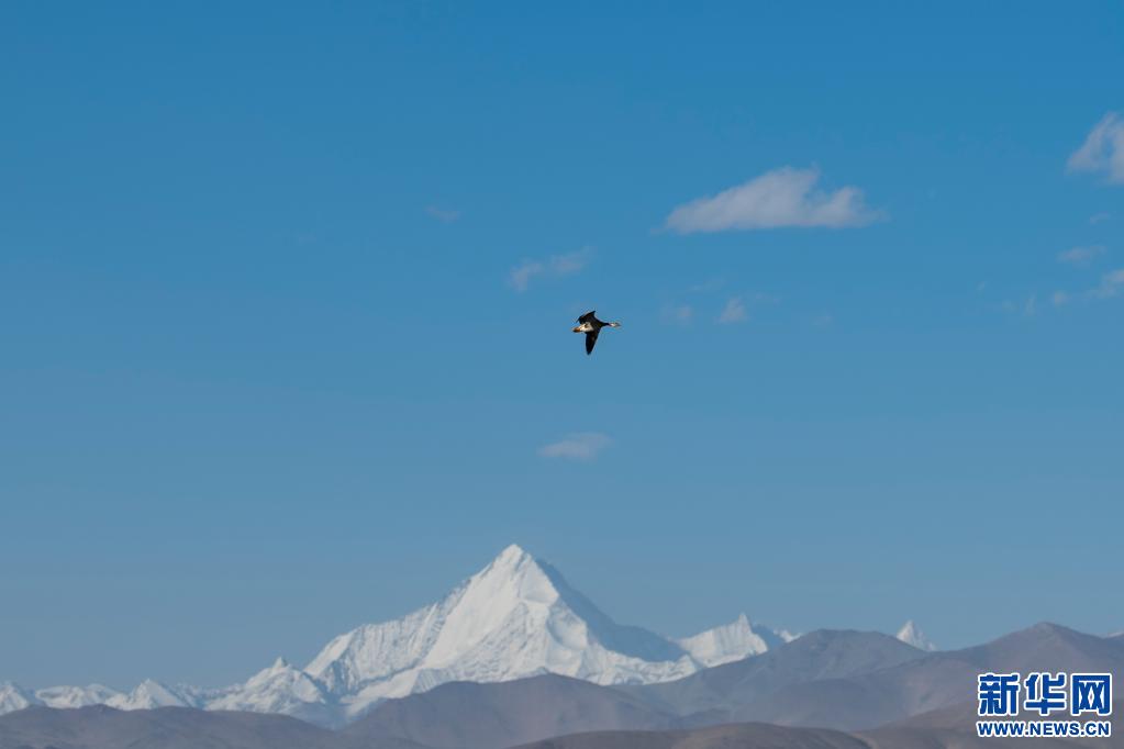 5月16日,在西藏仲巴縣里孜口岸附近,一只斑頭雁從空中飛過。新華社記者 孫瑞博 攝