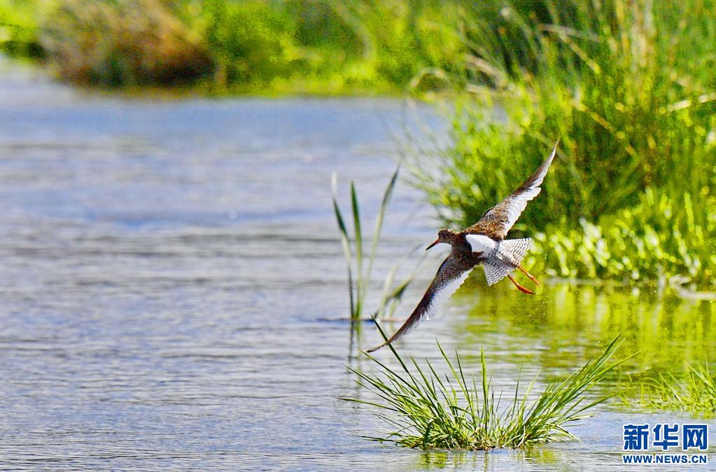 棲息在拉魯濕地核心區(qū)里的紅腳鷸(6月2日攝)。新華社記者 張汝鋒 攝