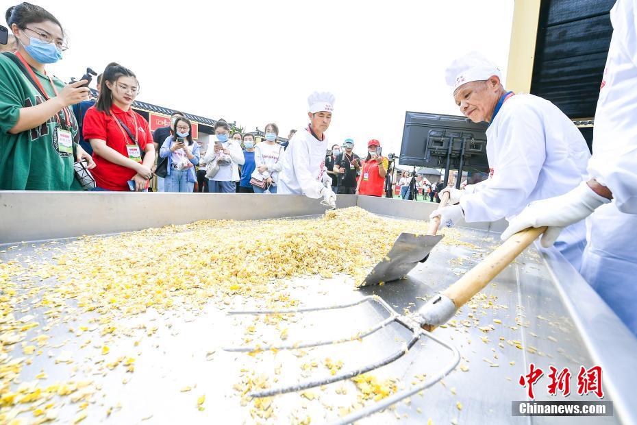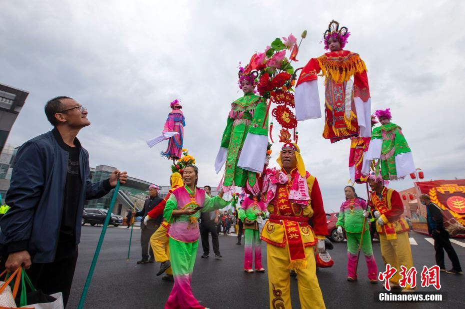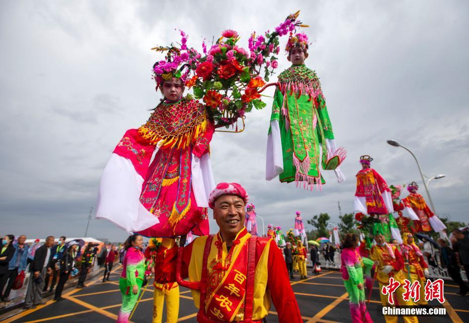 9月23日,山西晉中,當(dāng)?shù)孛癖姳硌萆缁饝c祝豐收節(jié)。當(dāng)日,2021年中國農(nóng)民豐收節(jié)山西慶?;顒郁叩谄邔弥袊ㄉ轿鳎┨厣r(nóng)產(chǎn)品交易博覽會在晉中國家農(nóng)高區(qū)(山西省農(nóng)產(chǎn)品國際交易中心)開幕。 中新社記者 張云 攝