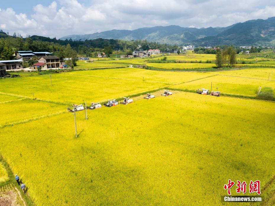 9月23日,2021年中國農(nóng)民豐收節(jié)·第一屆“天生云陽”金秋節(jié)在重慶云陽縣鳳鳴鎮(zhèn)拉開序幕。時下正是豐收的季節(jié),三峽庫區(qū)腹地重慶云陽縣的農(nóng)民門正忙著搶收搶曬,確保水稻玉米等農(nóng)作物顆粒歸倉。圖為在重慶云陽縣路陽鎮(zhèn),一字排開的8臺大型收割機正在稻田中收割成熟的水稻。劉興敏 攝