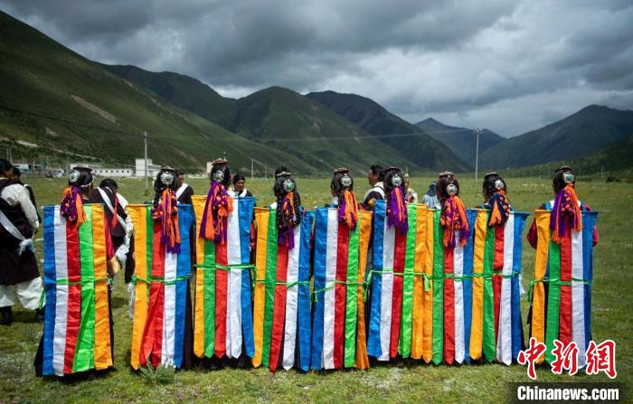 盛夏的西藏自治區(qū)拉薩市墨竹工卡縣門巴鄉(xiāng)仁多崗村草地上,28歲的尼瑪與身著盛裝的藏族牧民們跳著國家級非物質(zhì)文化遺產(chǎn)直孔普堆巴宣舞,迎接遠(yuǎn)道而來的游客,動(dòng)作優(yōu)美的歌舞吸引了大家駐足觀賞,并用手機(jī)或相機(jī)記錄。