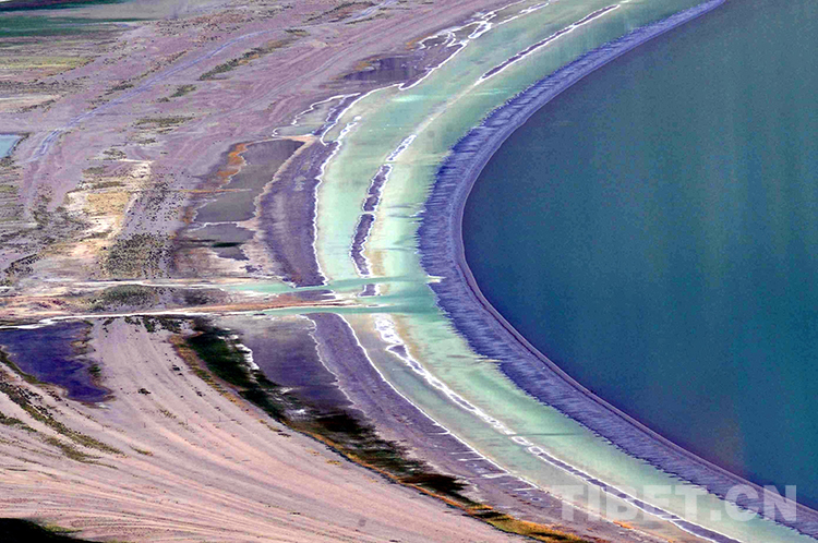 圖為班戈縣被賦予美麗傳說(shuō)的硼砂湖。它的周?chē)?道寬寬的環(huán)湖圈,有綠色的,有棕色的,五彩斑斕,清晰可見(jiàn)(唐召明2001年攝)