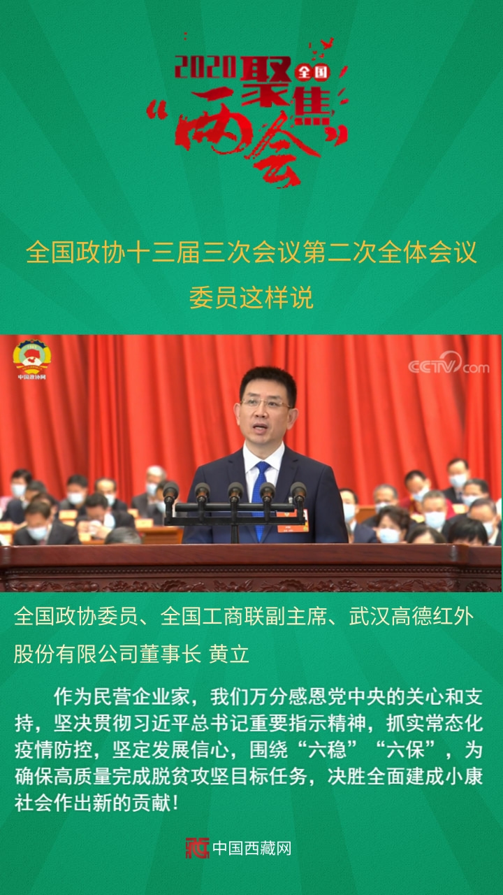 全國政協(xié)委員、全國工商聯(lián)副主席、武漢高德紅外股份有限公司董事長黃立發(fā)言說,作為民營企業(yè)家,我們?nèi)f分感恩黨中央的關(guān)心和支持,堅決貫徹習近平總書記重要指示精神,抓實常態(tài)化疫情防控,堅定發(fā)展信心,圍繞“六穩(wěn)”“六保”,為確保高質(zhì)量完成脫貧攻堅目標任務(wù),決勝全面建成小康社會作出新的貢獻!