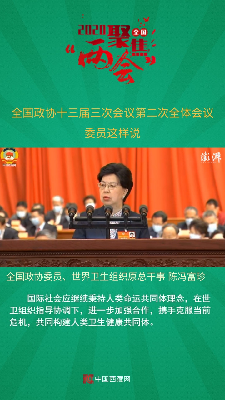 全國政協(xié)委員、世界衛(wèi)生組織原總干事陳馮富珍發(fā)言說,國際社會應(yīng)繼續(xù)秉持人類命運共同體理念,在世衛(wèi)組織指導協(xié)調(diào)下,進一步加強合作,攜手克服當前危機,共同構(gòu)建人類衛(wèi)生健康共同體。