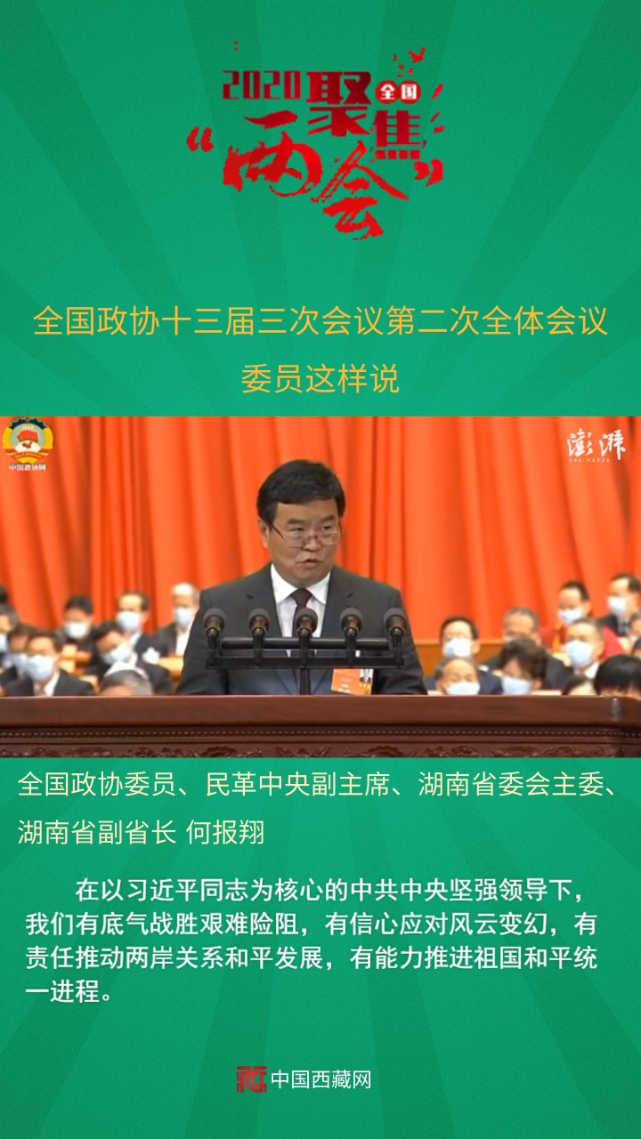 全國政協(xié)委員、民革中央副主席、湖南省委會主委、湖南省副省長何報翔發(fā)言說,在以習近平同志為核心的中共中央堅強領(lǐng)導下,我們有底氣戰(zhàn)勝艱難險阻,有信心應(yīng)對風云變幻,有責任推動兩岸關(guān)系和平發(fā)展,有能力推進祖國和平統(tǒng)一進程。