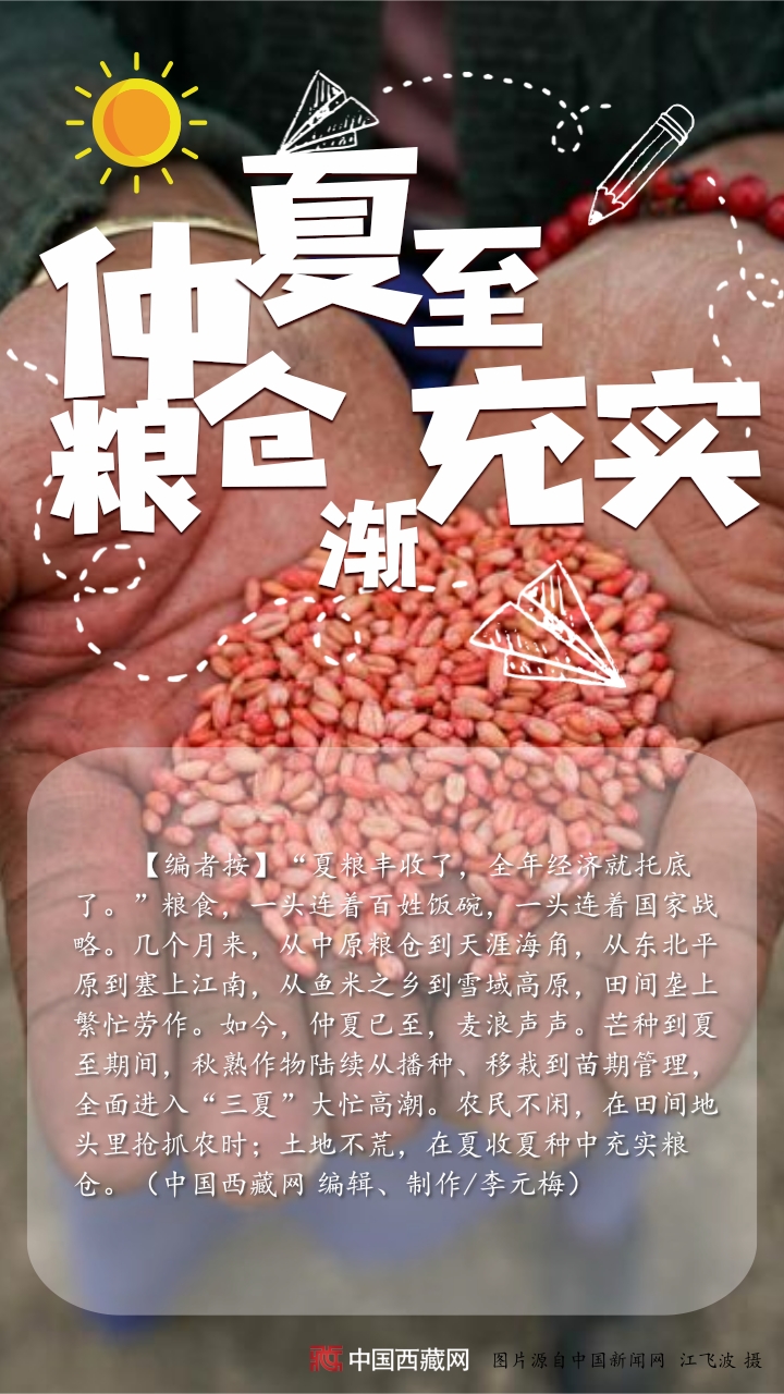 【編者按】“夏糧豐收了,全年經(jīng)濟就托底了。”糧食,一頭連著百姓飯碗,一頭連著國家戰(zhàn)略。幾個月來,從中原糧倉到天涯海角,從東北平原到塞上江南,從魚米之鄉(xiāng)到雪域高原,田間壟上繁忙勞作。如今,仲夏已至,麥浪聲聲。芒種到夏至期間,秋熟作物陸續(xù)從播種、移栽到苗期管理,全面進入“三夏”大忙高潮。農(nóng)民不閑,在田間地頭里搶抓農(nóng)時;土地不荒,在夏收夏種中充實糧倉。(中國西藏網(wǎng) 編輯、制作/李元梅)