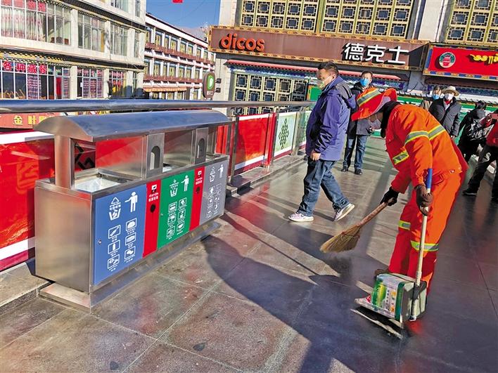據(jù)城關(guān)區(qū)環(huán)衛(wèi)局局長米瑪次仁介紹,截至2019年底,城關(guān)區(qū)環(huán)衛(wèi)局與拉薩城投潔達(dá)環(huán)衛(wèi)保潔有限公司積極與部分企事業(yè)單位、學(xué)校及社區(qū)等47個區(qū)域?qū)樱謩e投放了四分類垃圾箱120套、240L垃圾桶658個、有害垃圾消納袋116個、腳踏兩分類垃圾桶321個。已建成并投入使用的積分兌換超市3家、垃圾分類投放亭4座、垃圾分類可回收物臨時存放點13個、有害垃圾臨時存放點2個;采購2臺可回收物運(yùn)輸車輛、1臺有害垃圾運(yùn)輸車輛、2臺餐廚垃圾運(yùn)輸車輛和1臺大件垃圾運(yùn)輸車輛。在春節(jié)和藏歷新年期間,抽調(diào)工作人員在娘熱南路、北京東路、江蘇南路、康昂南路、林廓東路、沖賽康天橋、熱木其天橋、八廓商城天橋、阜康天橋等人流量較多的區(qū)域放置了垃圾四分類果皮箱。