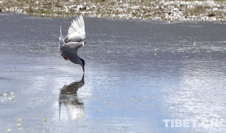 圖為一只鳥兒在納木措湖畔水域覓食 攝影:王媛媛