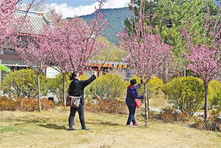在林芝市福建公園一角,花開燦爛,柳葉初萌,人們紛紛走出家門,來到公園欣賞美景。圖為群眾在樹下拍照留念。王珊 攝