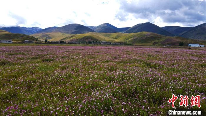 稻城縣噶通鎮(zhèn)八美村位于亞丁機(jī)場前往亞丁景區(qū)的交通要道上。長期以來,這片草原沙化現(xiàn)象日益嚴(yán)重,當(dāng)?shù)卮迕褓囈陨娴膫鹘y(tǒng)放牧都難以為繼。2016年以來,稻城縣利用生態(tài)治理工程實(shí)施的契機(jī),整合全域旅游和脫貧攻堅等涉農(nóng)涉旅資金,在沙化草原上大面積種植格桑花,將1599畝沙化草地打造成色拉花海。