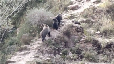 黑豹野生動(dòng)物保護(hù)站站長(zhǎng)李理介紹:“我們傍晚5點(diǎn)左右架設(shè)好設(shè)備, 6點(diǎn)30分左右就拍到藏棕熊了,當(dāng)時(shí)非常興奮”。他說:“當(dāng)時(shí)天馬上就黑了,山里忽然下起了冰渣子,藏棕熊就在樹林間若隱若現(xiàn),后來它跑到一個(gè)光禿禿的山下,它狀態(tài)很好,非常健壯。”很快,大家又發(fā)現(xiàn)了第二只。隊(duì)員們的衣服都被冰渣子打濕了,高山上非常冷,但還是給相機(jī)做好防水,拍下了這寶貴的畫面。第二天傍晚,還是在同一地點(diǎn),前一天晚上觀測(cè)到的一只藏棕熊再次出現(xiàn),不過這次,它帶了兩只小熊。大公熊強(qiáng)壯而霸道,帶幼崽的母熊小心謹(jǐn)慎,小熊憨態(tài)可掬,都非??蓯?。