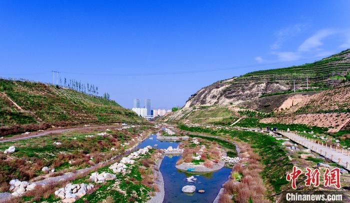 10月12日拍攝的生態(tài)修復(fù)項(xiàng)目治理后的火燒溝,河水清澈見(jiàn)底,溝壑險(xiǎn)坡重披綠裝。 中新社記者 孫睿 攝