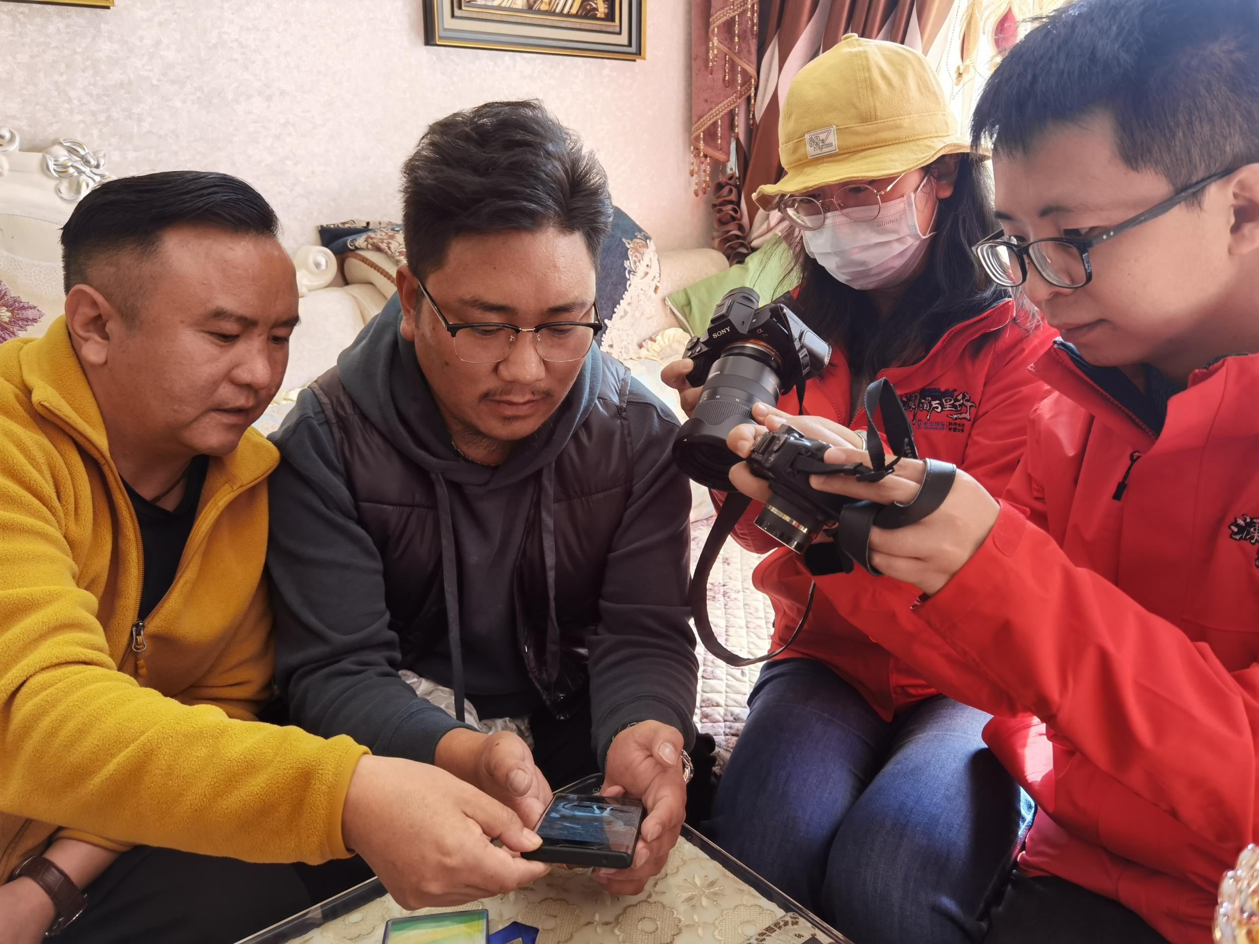 尕松義西(左二)給瀾湄萬里行中外記者翻看手機(jī)中野生動(dòng)物的照片