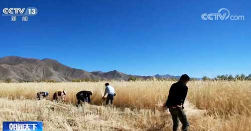 在雅魯藏布江北岸的南木林縣艾瑪鄉(xiāng),當(dāng)?shù)?00萬(wàn)平方米的綠麥草迎來(lái)了豐收,這些天,大伙正忙著收割。