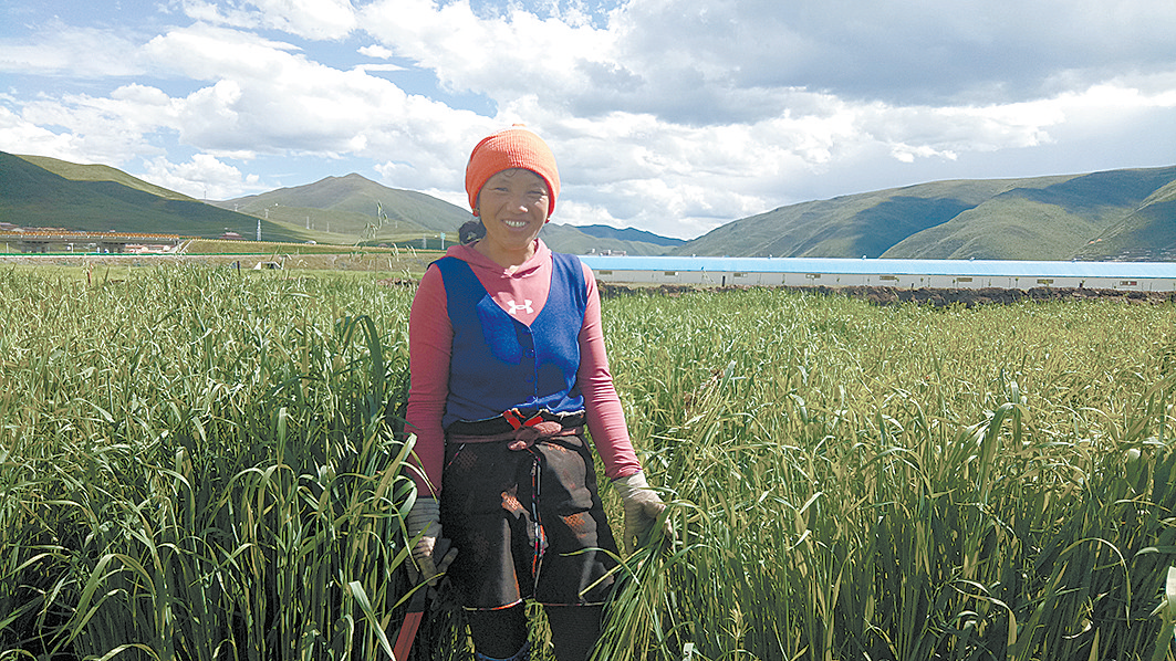 澤白是門堂鄉(xiāng)門堂村的貧困戶,家里有四口人,這些年,得益于草原補(bǔ)助、生態(tài)管護(hù)員等脫貧政策,澤白家于2016年脫貧。禁牧實(shí)施以來,澤白和丈夫種植了0.3公頃(五畝)草地早熟禾,當(dāng)記者見到澤白時,她正在一片綠油油的田地間“揮舞”著鐮刀,身邊已有好幾摞割好的早熟禾。