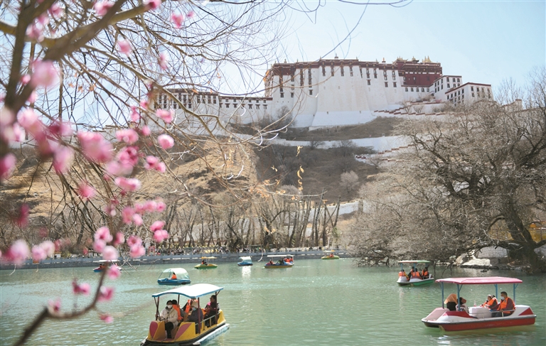 圖為3月1日,宗角祿康公園里的桃花競相綻放,不少游客趁著春光游園賞美景。平措旺堆攝