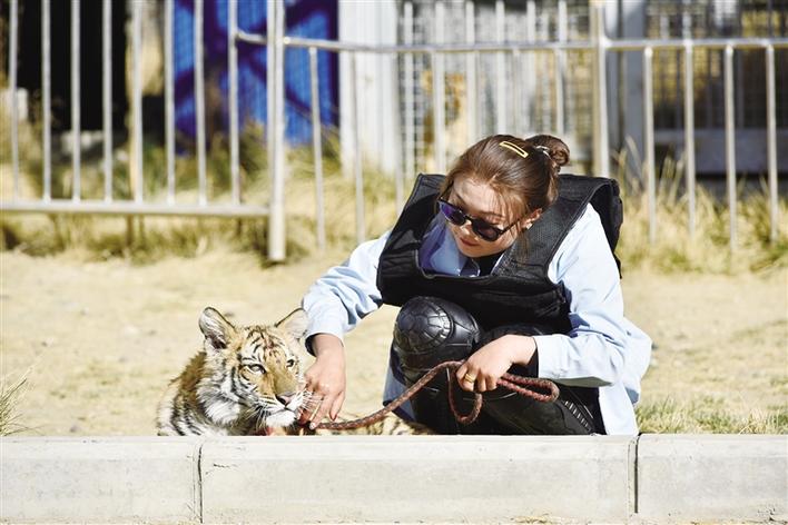 當記者看到四只幼獅時,它們時而聚在一起,時而沿著籠子邊溜達,時而張開大嘴向著外人示威,還有一個非常活躍的在攀爬籠子。小老虎次仁卓瑪雖然沒有兄弟姐妹的陪伴,不過園區(qū)的獸醫(yī)小姐姐成了它最貼心的玩伴。每天,獸醫(yī)小姐姐都會帶著次仁卓瑪進行戶外活動,次仁卓瑪像小朋友一樣喜歡玩皮球,喜歡追著獸醫(yī)小姐姐跑,還特別喜歡獸醫(yī)小姐姐給它按摩,經(jīng)常會撒嬌求抱抱。