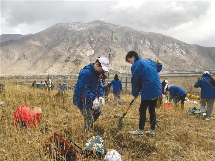 圖為青年志愿者在拉薩市堆龍德慶區(qū)“西藏青年志愿者林”義務(wù)植樹。次仁羅布 李洲 攝