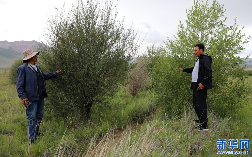 索朗羅布(右)在檢查樹的長(zhǎng)勢(shì)(2020年8月8日攝)。新華社記者 覺果 攝