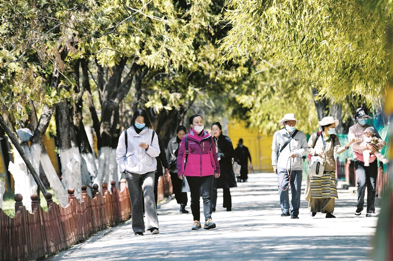 春風(fēng)送暖,四月的拉薩逐漸退去冬日銀妝。湛藍的天空下,柳樹舒展開了黃綠嫩葉的枝條,在微微的春風(fēng)中輕柔地拂動,就像一群群身著綠裝的仙女在翩翩起舞,夾在柳樹中間的桃樹也開出了鮮艷的花朵,綠的柳,紅的花,真是五彩繽紛,令人目不暇接。