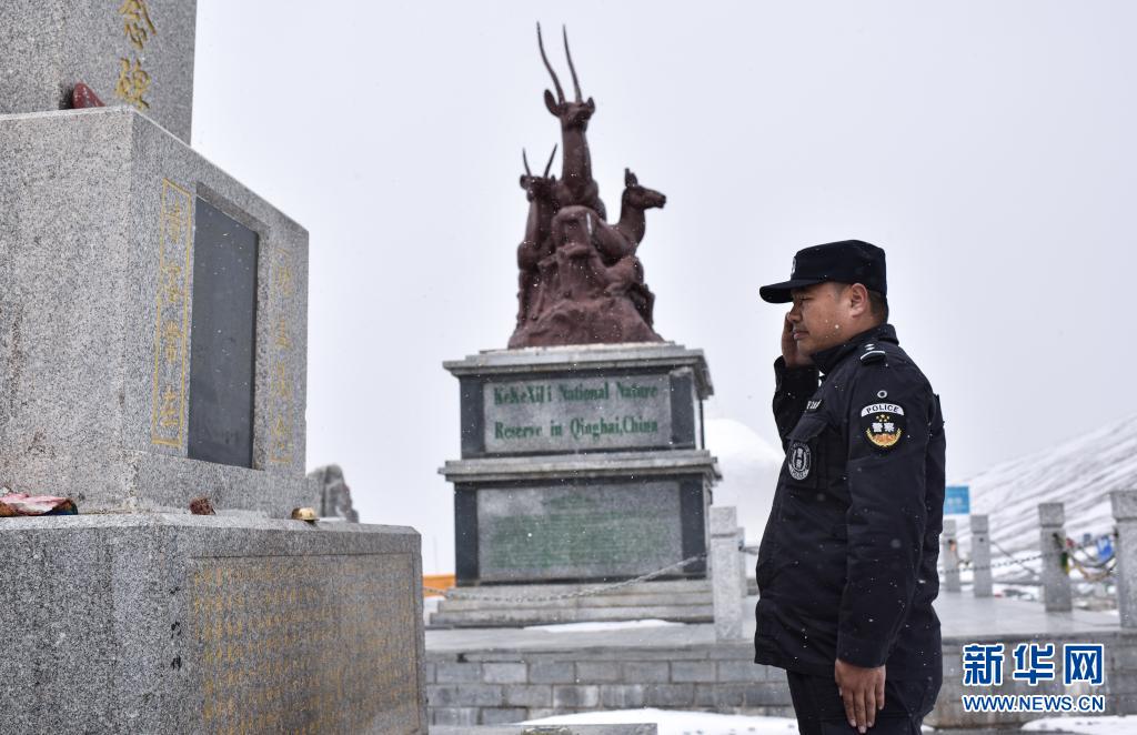 4月20日,袁廣明在昆侖山埡口向索南達(dá)杰紀(jì)念碑敬禮。新華社記者 吳剛 攝