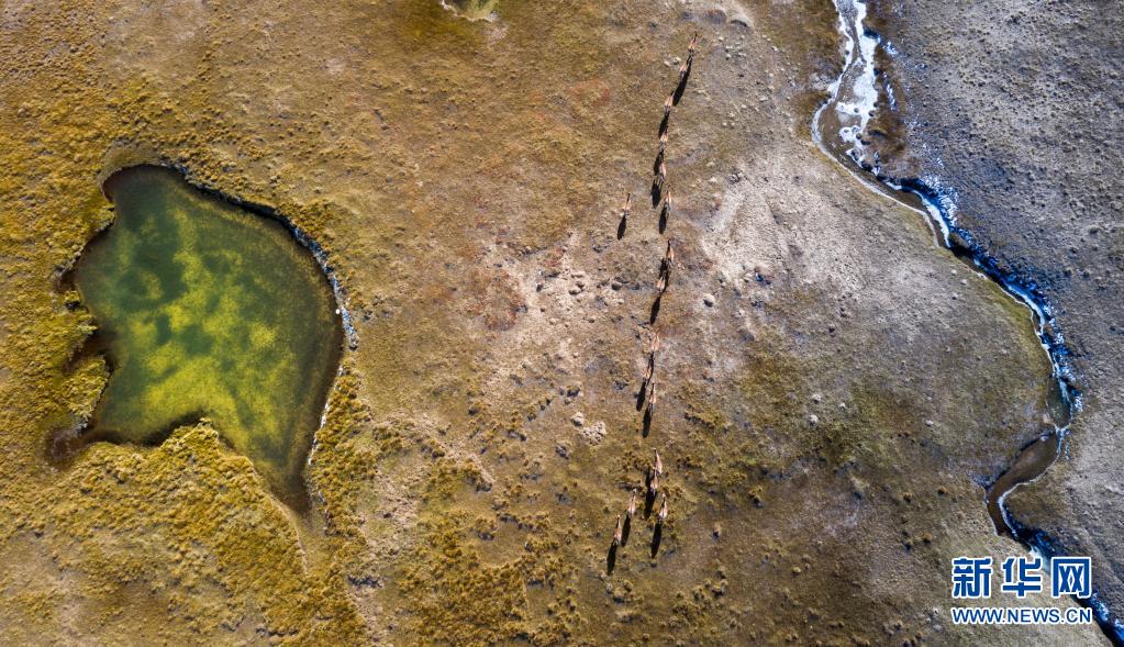 2019年10月19日,藏野驢在三江源地區(qū)活動(dòng)(無(wú)人機(jī)照片)。新華社記者 吳剛 攝