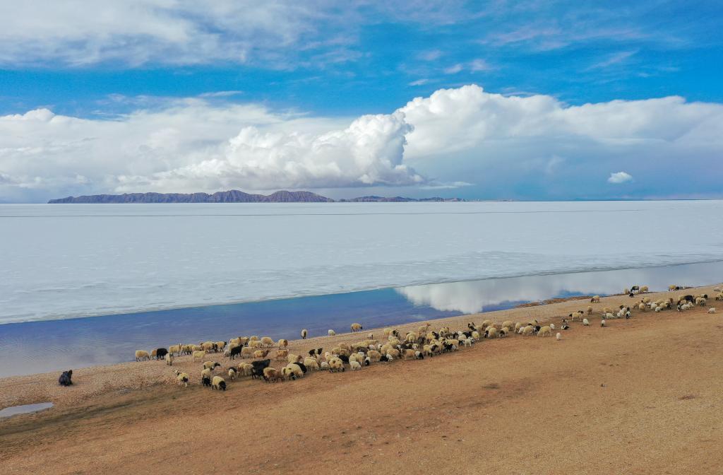 牧民指揮羊群從色林錯(cuò)經(jīng)過(2020年4月29日無人機(jī)攝)。新華社記者田金文 攝