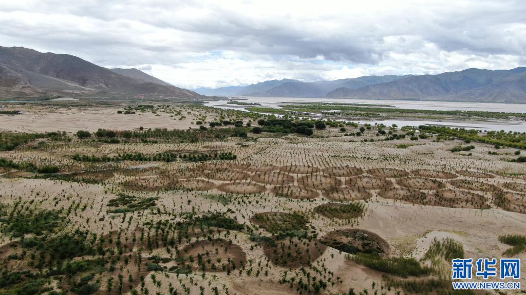雅魯藏布江山南段沙丘上人工造林的樹(shù)苗(7月20日 無(wú)人機(jī)攝)。新華社記者 晉美多吉 攝