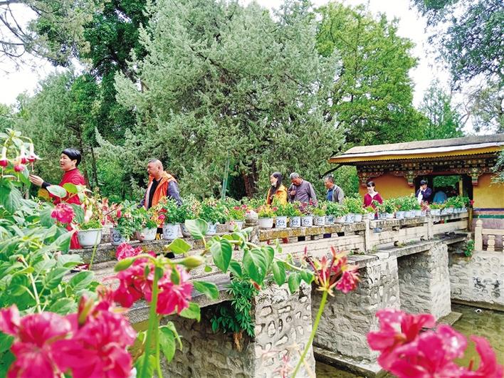 在羅布林卡廣場(chǎng),擺放的花卉吸引人們拍照打卡留念。走進(jìn)園內(nèi),一陣清涼感迎面撲來(lái),雨后的羅布林卡空氣濕潤(rùn),除了花草的香味還可以聞到一絲泥土的氣息。充沛的雨水讓園內(nèi)的樹(shù)木更加蔥郁、花朵更加?jì)善G。作為每年盛夏時(shí)期拉薩市區(qū)內(nèi)最佳的避暑去處,羅布林卡吸引著本地市民群眾、區(qū)外游客紛至沓來(lái)。