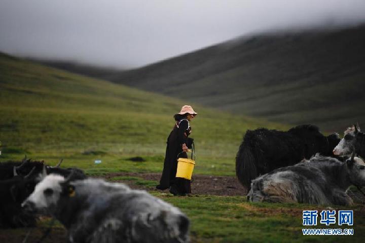 8月3日,在果洛州瑪沁縣當洛鄉(xiāng)貢龍村的夏季草場上,牧民準備擠牛奶。新華社記者 張龍 攝