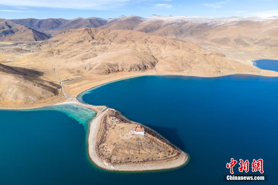 12月28日,羊卓雍錯湖岸風光。羊卓雍錯藏語意為“碧玉湖”,與納木錯、瑪旁雍錯并稱西藏三大“圣湖”。羊卓雍錯湖面海拔4441米,東西長130公里,南北寬70公里,湖岸線總長250多公里。28日,中新網(wǎng)記者自駕前往羊卓雍錯,翻過山口,到達湖岸東北面的日托寺,沿途盡是冬日高原湖光山色之美,無人機航拍鏡頭下,遠處雪山、冰川巍峨屹立,堪稱絕美。 江飛波 攝