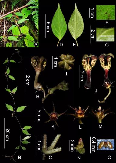 2021年7月中旬至8月初,由西雙版納植物園星耀武研究員率隊(duì)的聯(lián)合考察隊(duì),對(duì)西藏日喀則地區(qū)喜馬拉雅南坡的維管植物進(jìn)行了考察和標(biāo)本采集。考察人員在吉隆縣薩勒鄉(xiāng)發(fā)現(xiàn)一種正處于盛花期的吊燈花屬未知植物。通過(guò)解剖拍照、文獻(xiàn)查閱及相似種的模式標(biāo)本核對(duì)后,最終確認(rèn)為一新種。根據(jù)其模式產(chǎn)地,將其命名為吉隆吊燈花(Ceropegia jilongensis)。