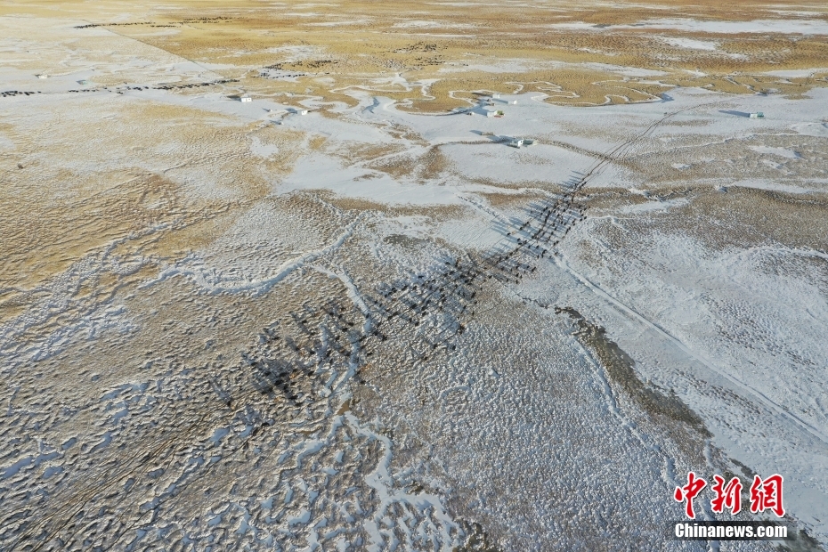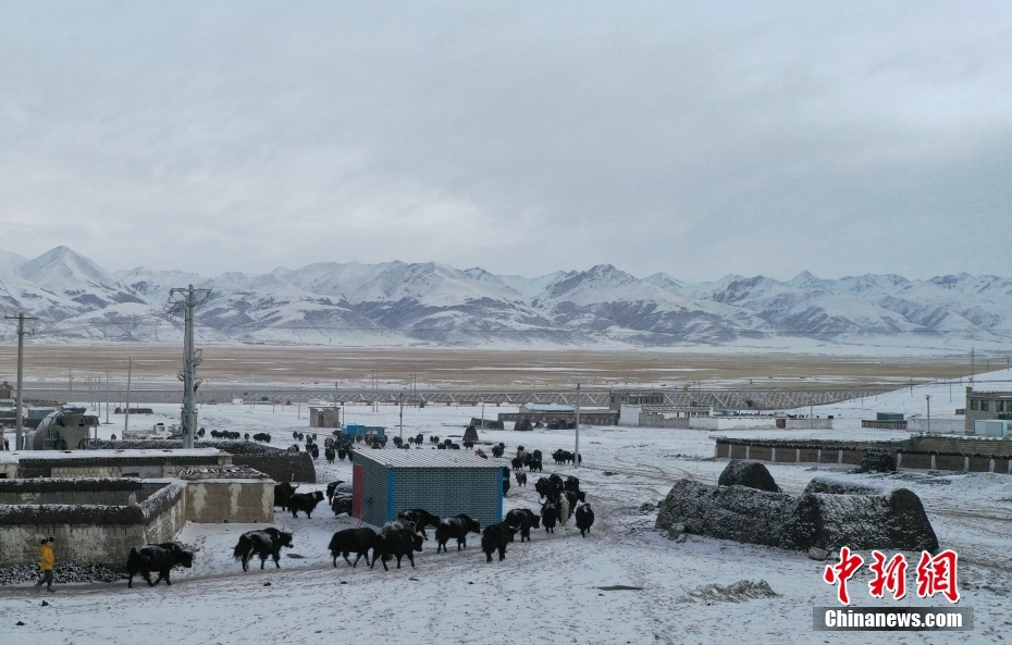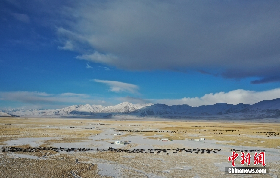 1月27日,當(dāng)雄縣龍仁鄉(xiāng)烏達村牧民在雪中放牧。當(dāng)雄縣位于西藏自治區(qū)拉薩市北部,距拉薩市區(qū)170公里?!爱?dāng)雄”,藏語意為“天選牧場”,平均海拔約4200米,草場廣闊,土地肥沃。(無人機照片) 中新社記者 貢嘎來松 攝