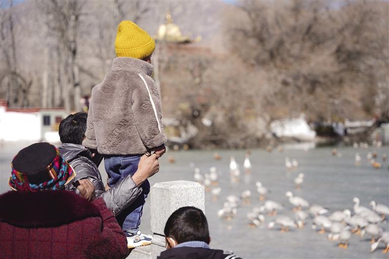 如果你想觀賞候鳥,可以前往拉薩3號壩橋,清澈的水面上候鳥聚集成群。米瑪頓珠和老伴站立在橋面上,靜靜欣賞著候鳥,時不時還有候鳥飛過他們的頭頂,在半空中盤旋一番,再落到水面。