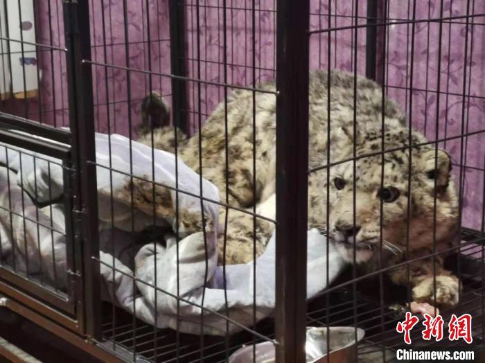 圖為受傷的雪豹等待救治?!埖さぁz