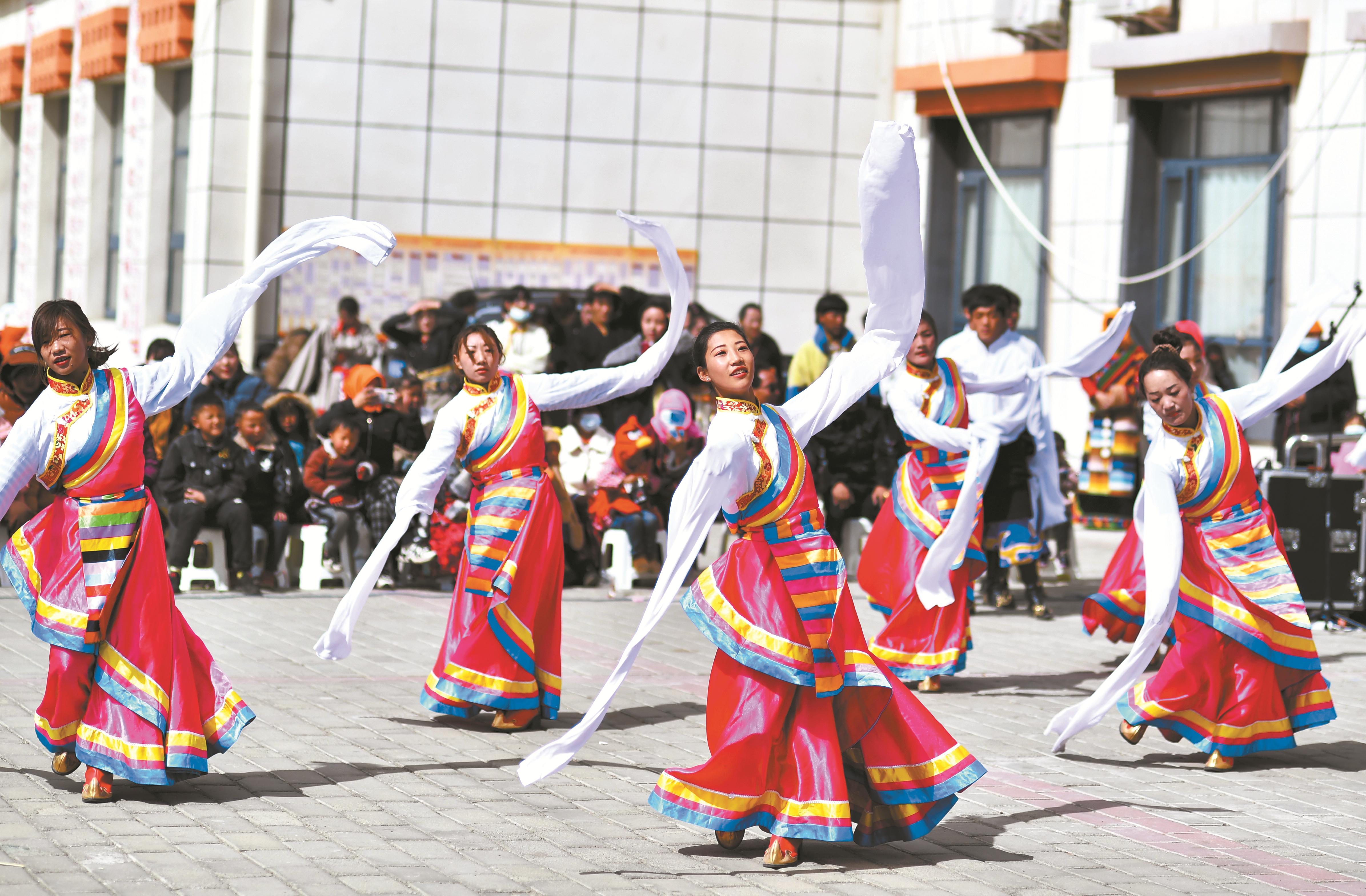 圖為搬遷牧民在搬遷點廣場上跳起民族舞蹈,迎接藏歷新年(2月28日攝)。新華社記者 覺 果攝